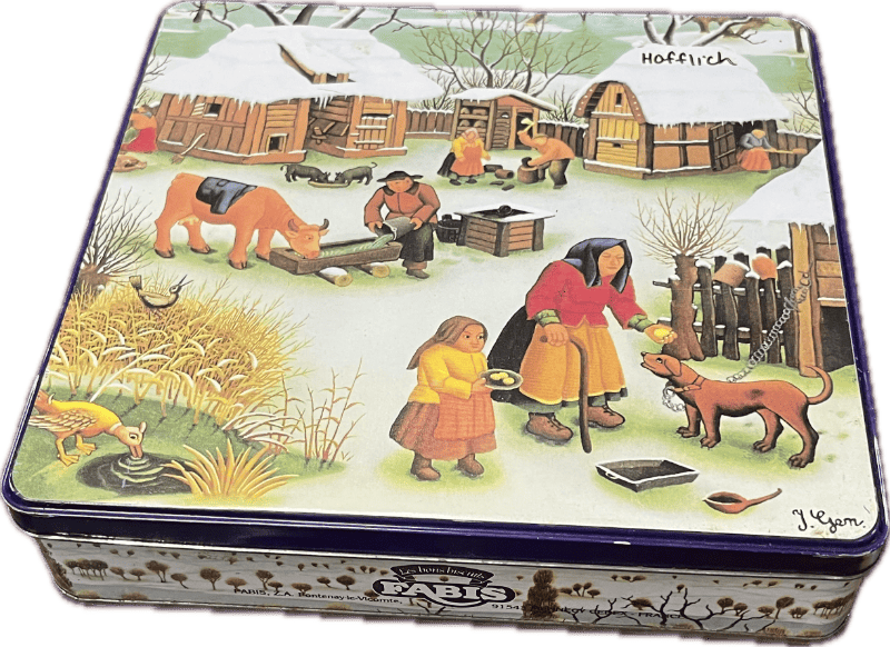 Made in France, vintage FABIS collectible decorative tin of a winter’s day.