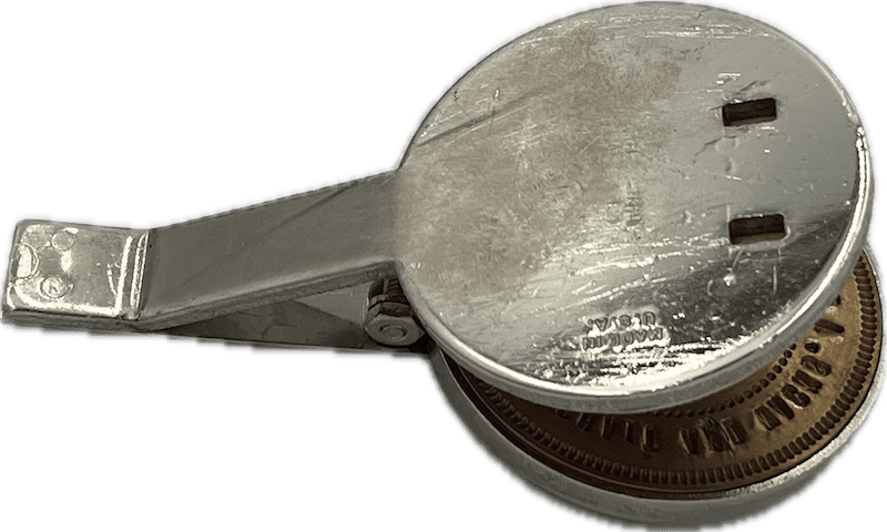 A vintage handheld metal embosser featuring a circular die plate and lever-style handle. The tool shows authentic patina and surface wear consistent with age.