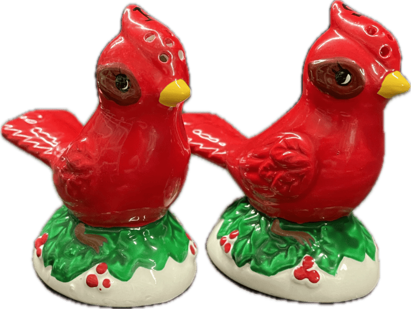 Vintage red cardinal salt and pepper shaker set with a holiday wreath base. Collectible shaker set from Japan, mid 20th century.