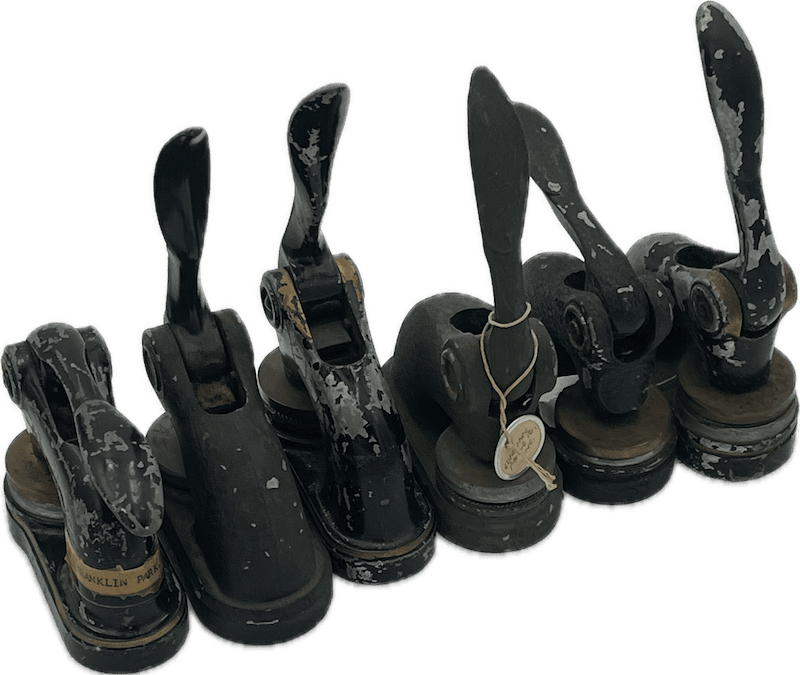 Set of six vintage notary and embossing seal presses, each made of heavy cast metal with aged paint, patina, and authentic wear.