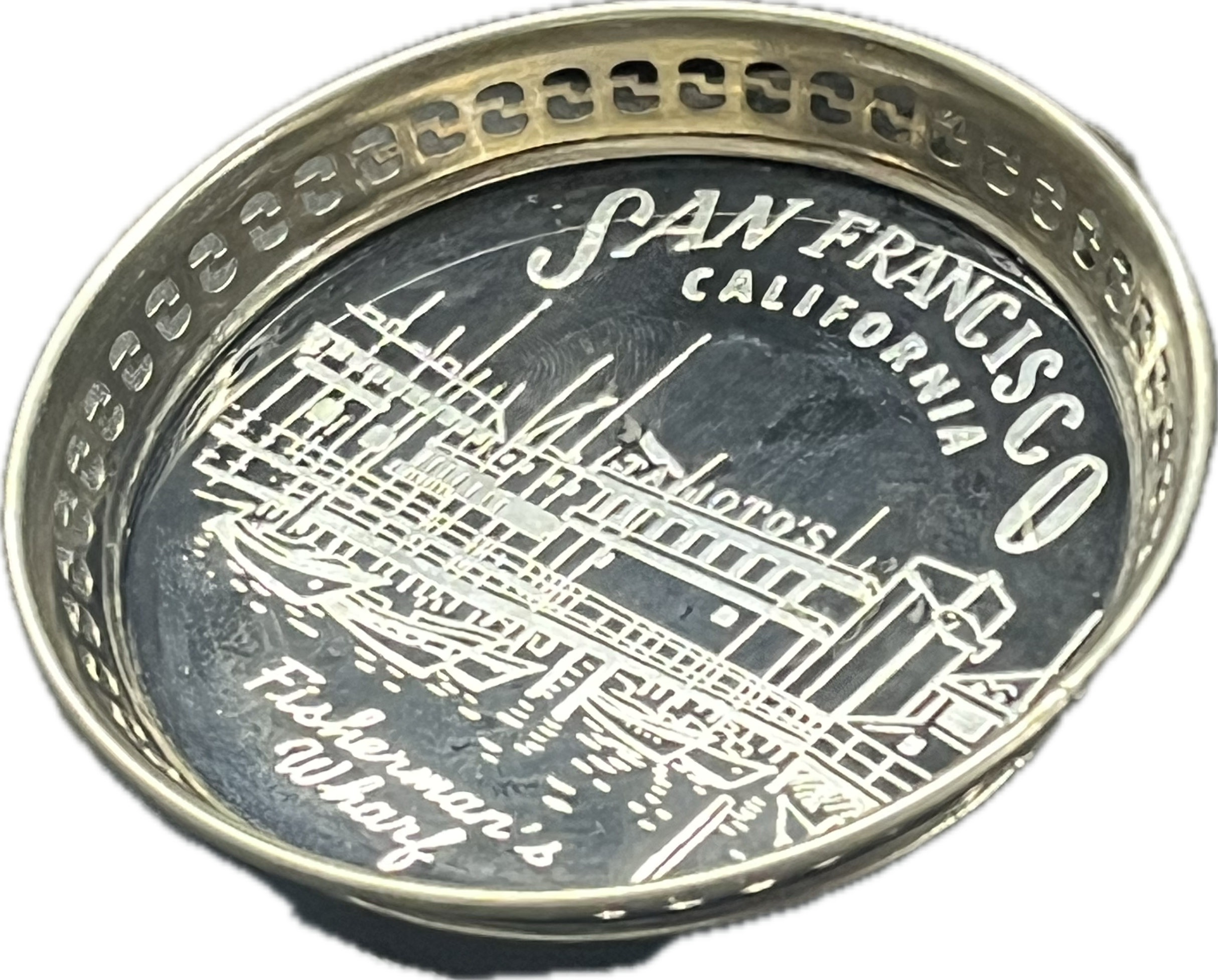 Vintage souvenir coaster featuring a depiction of Fisherman’s Wharf in San Francisco.