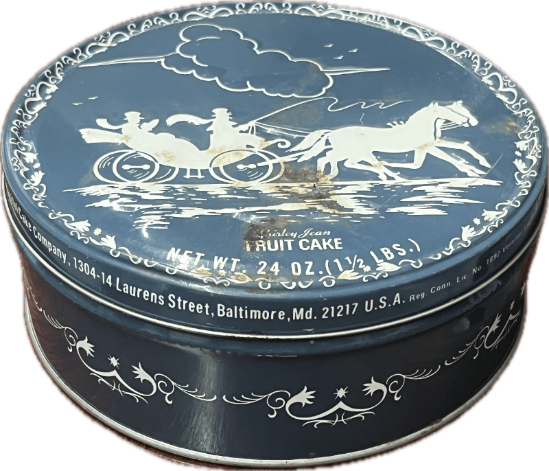 Vintage 1950s fruit cake tin that once held Shirley Jean Fruit Cake, made by the Capitol Cake Company of Baltimore, MD.