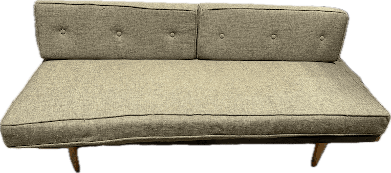 Vintage low-profile armless daybed with a slim, button-tufted backrest and single bench-style seat cushion. Upholstered in a neutral tweed-textured fabric with tapered wooden legs.