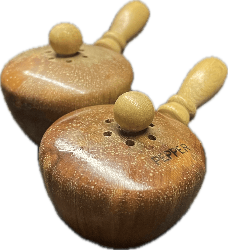 Vintage wooden saucepan salt and pepper shakers made in Japan.