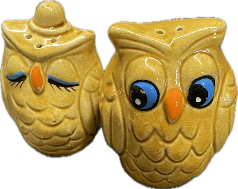 Vintage ceramic salt and pepper shaker set featuring two yellow owls. Novelty kitchenware produced in Japan for the export market,1950s to 1960s.