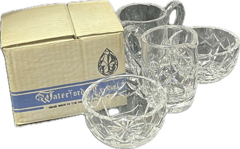 Waterford crystal sugar, creamer and bowls with diamond and wedge cuts with original box.