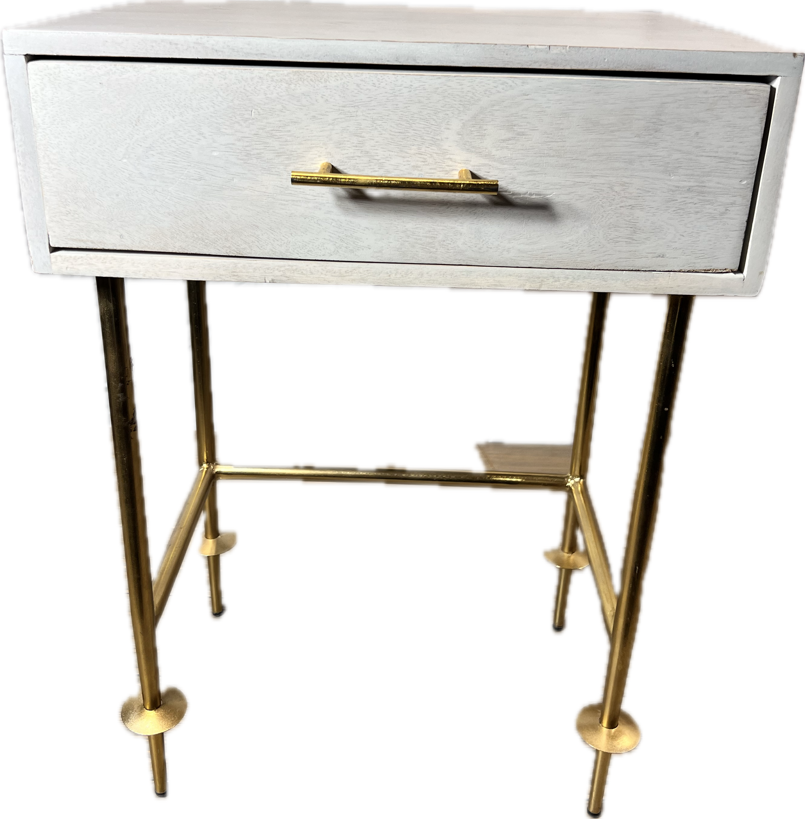 Light grey bedside table with 1 drawer and gold legs.