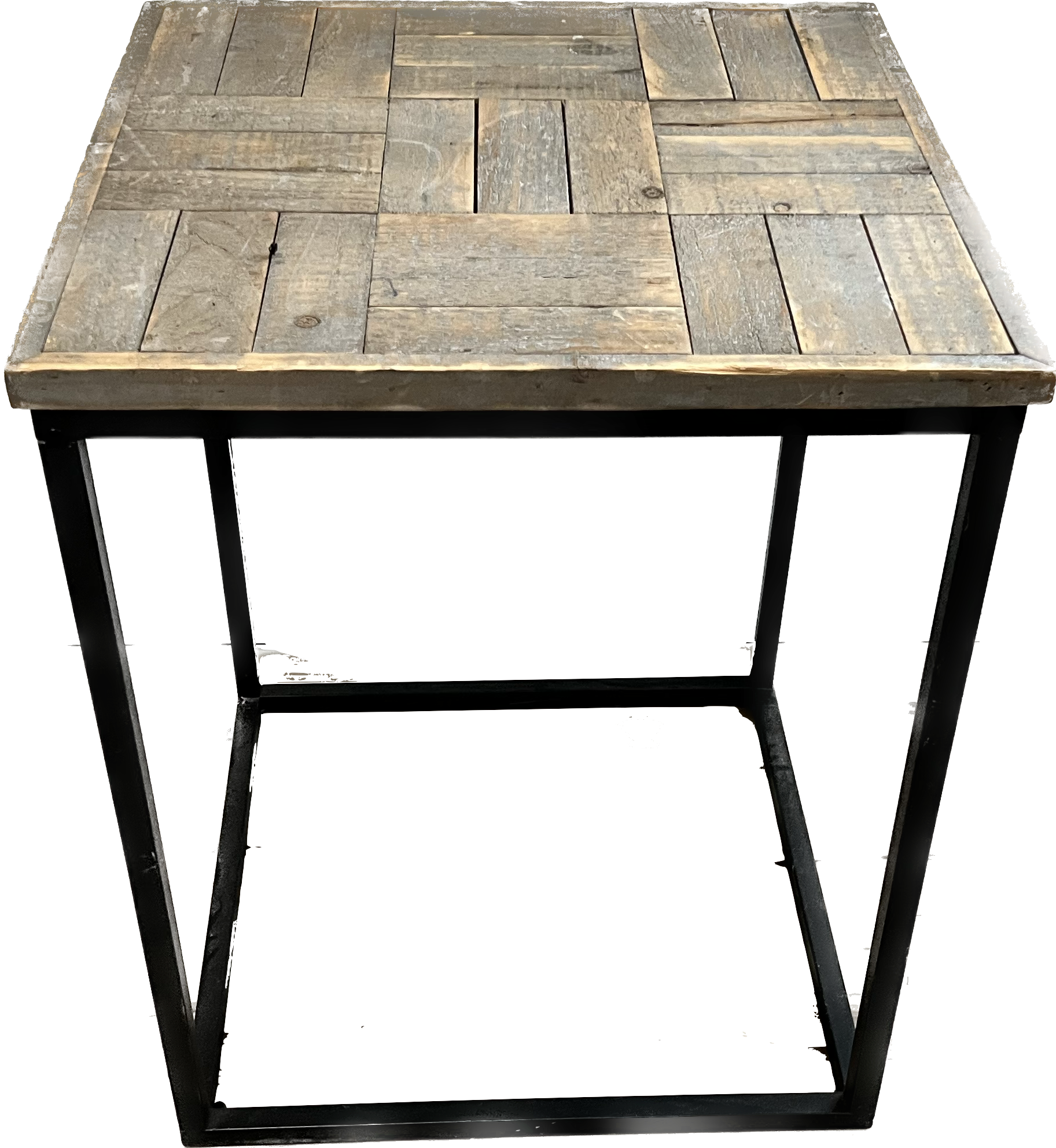 Weathered wood parquet-topped side table with dark metal base.