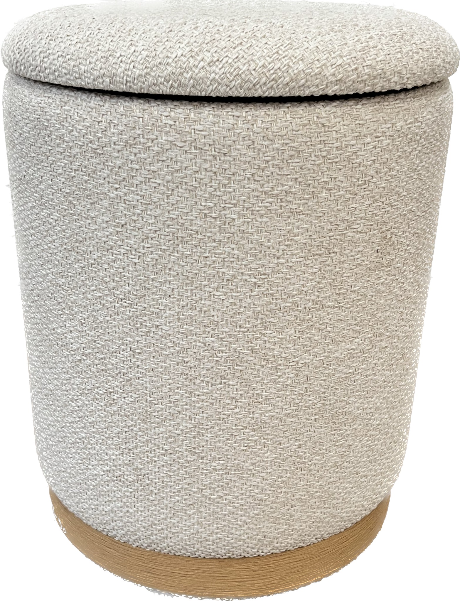 Wheat nubby fabric round storage ottoman with wood base.