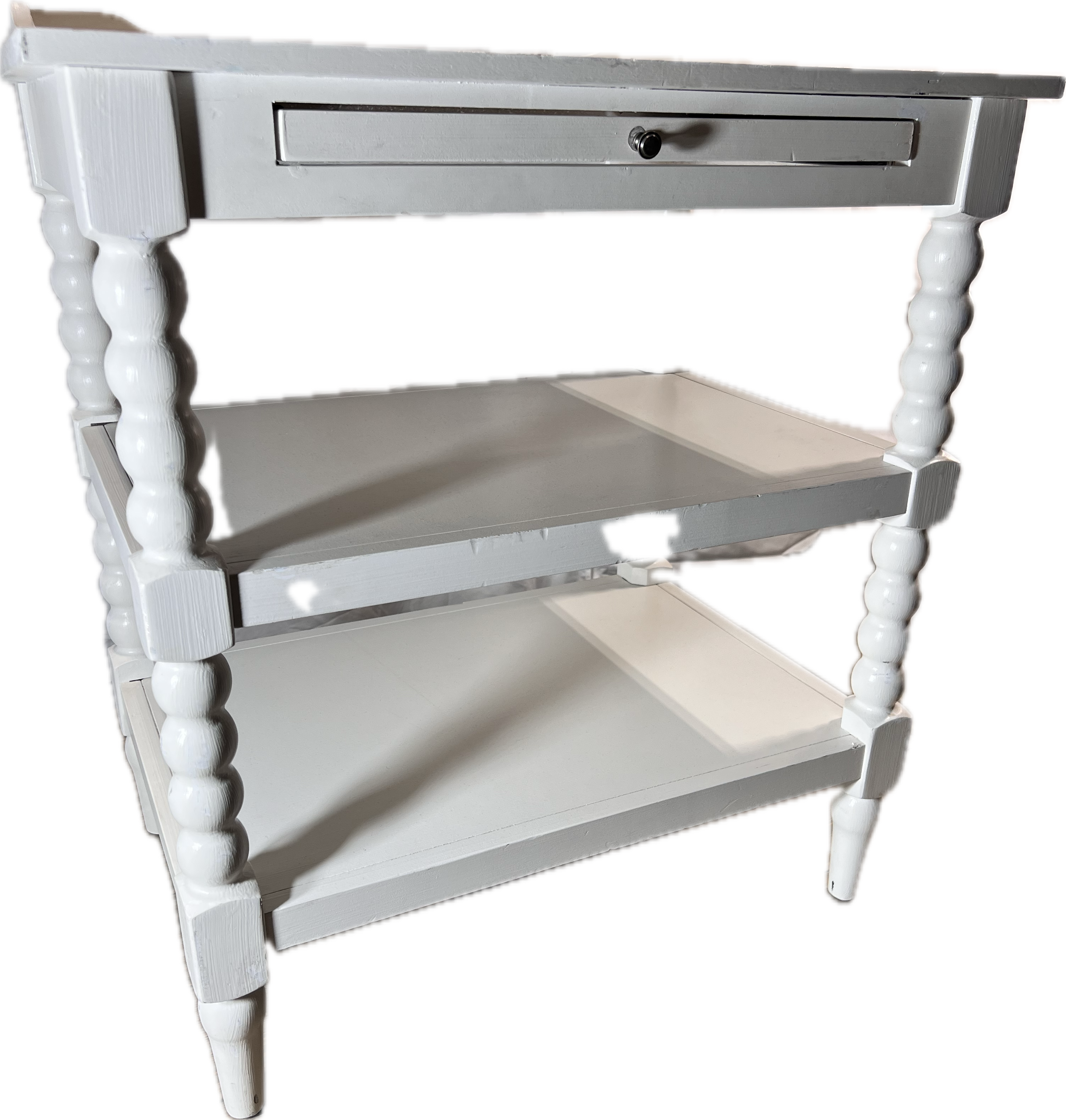 White bedside table with 2 shelves and a pull out flat surface.