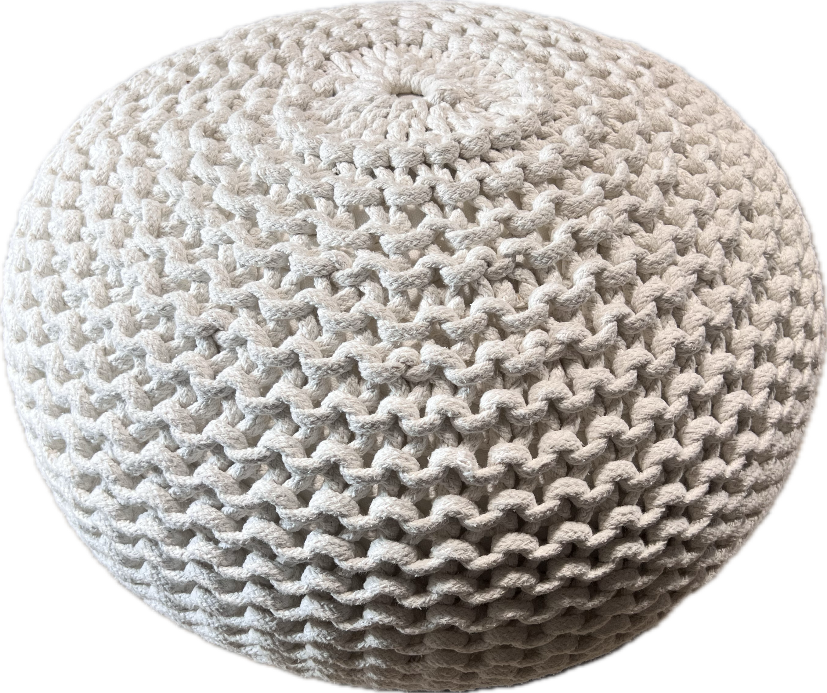 Round crochet white pouf.