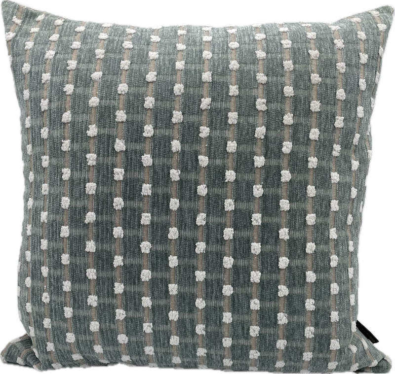 Chenille square pillow with white dot pattern.