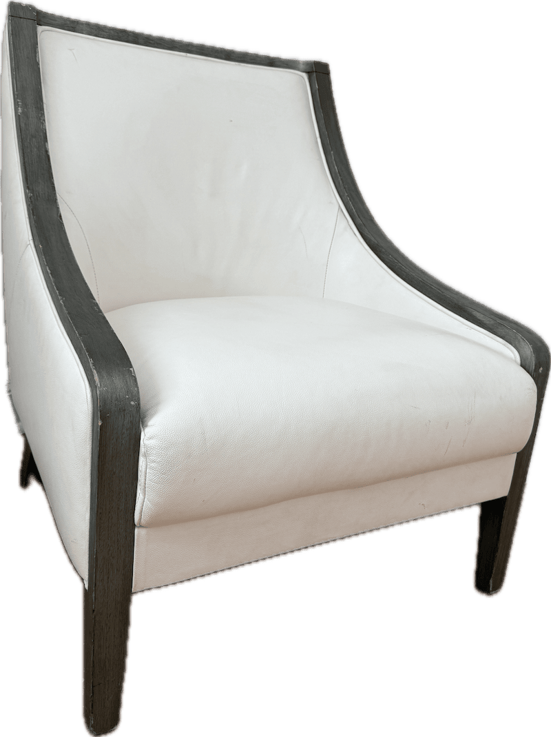 Low-profile leather accent chair with a gently curved back and integrated arms. Upholstered in white leather with a smooth, lightly textured finish.