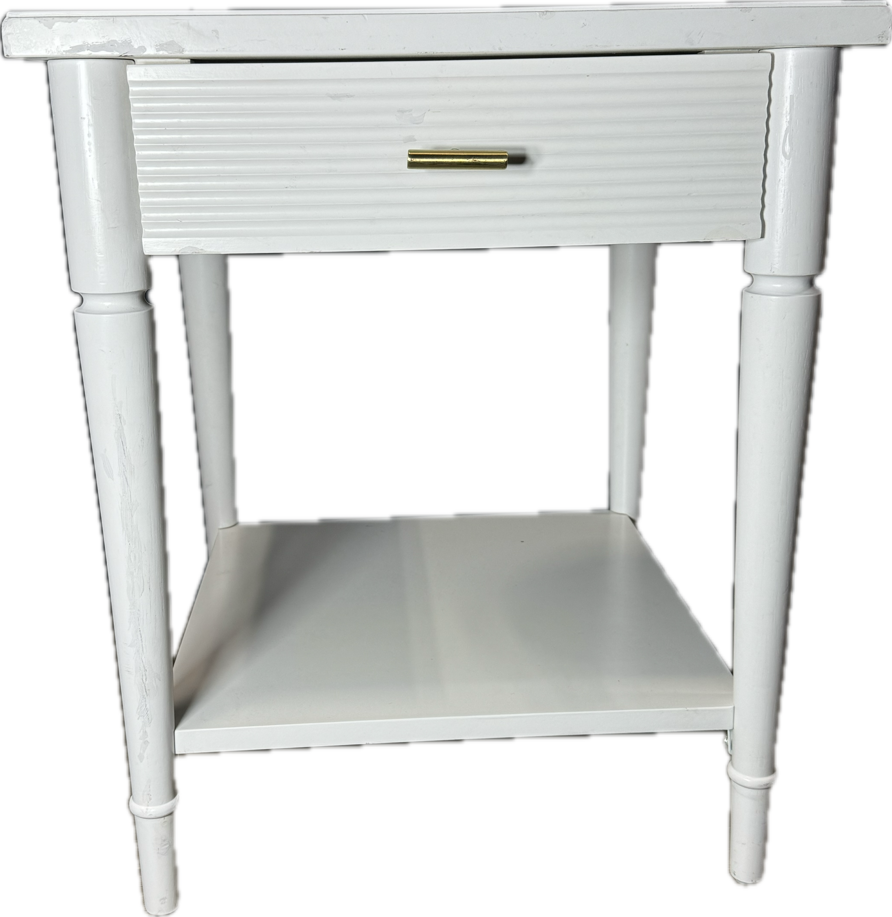 White bedside with ribbed drawer and rectangular gold handle.