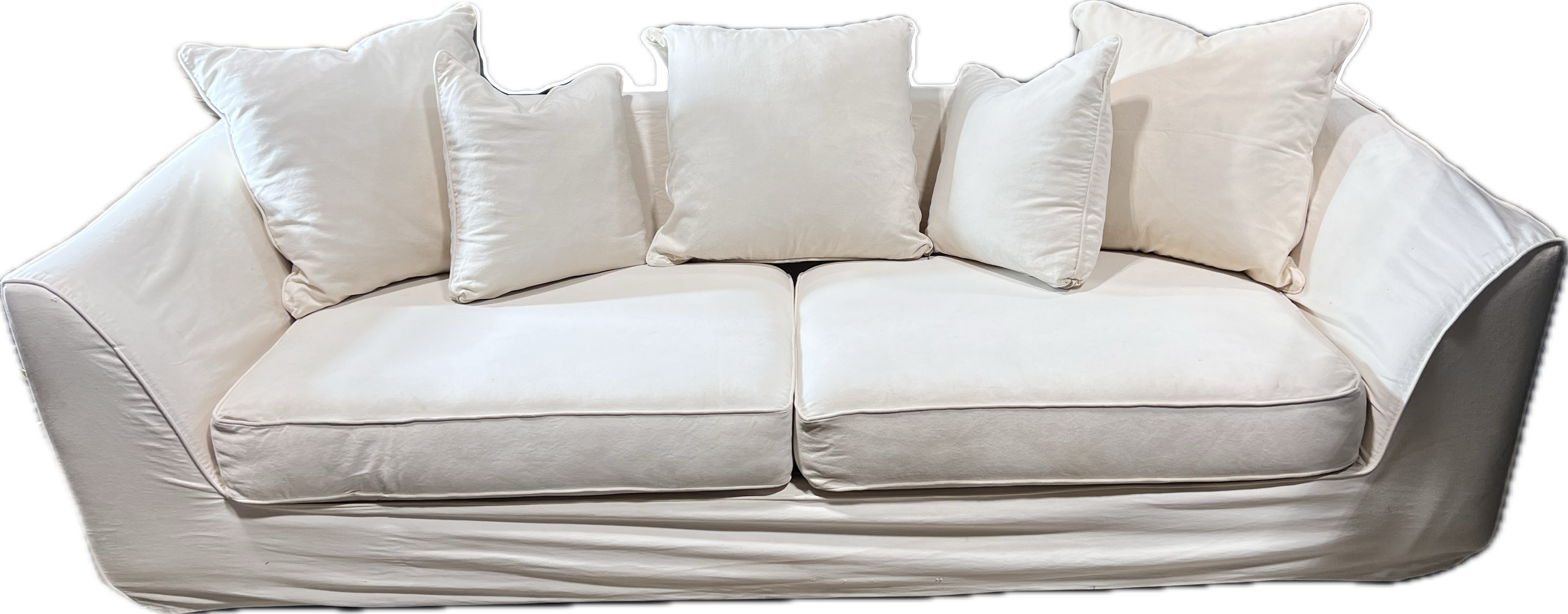 White slipcovered relaxed sofa with multi back pillows.