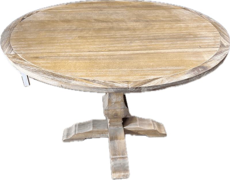 Wood drop leaf dining table and chairs with ladder-style back and carved center detail. Tie-on upholstered seat cushion in muted orange fabric.
