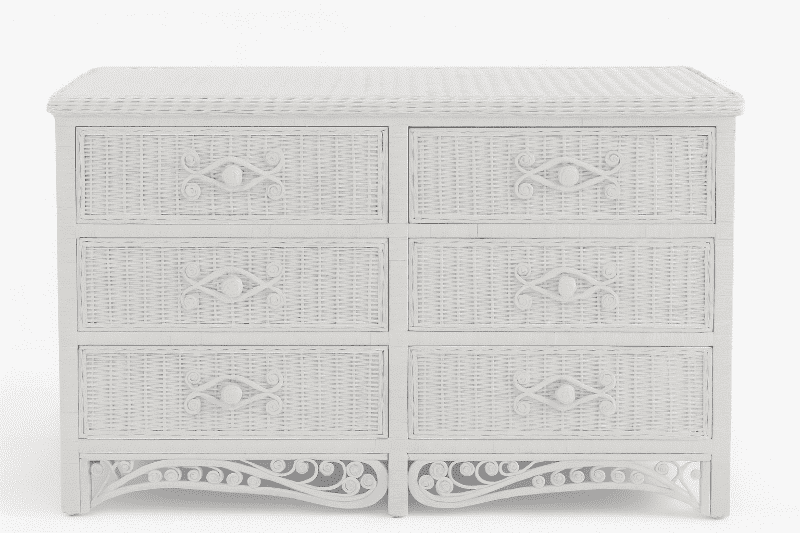 Classic six-drawer white wicker dresser featuring detailed woven texture, sculpted drawer fronts, and delicate scrollwork trim along the base.