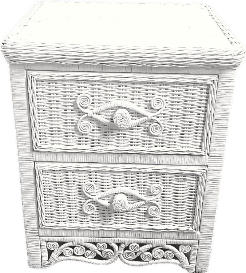 White wicker two-drawer nightstand featuring intricate woven detailing and decorative scrollwork. Drawers are accented with raised swirl motifs and round wicker knobs.