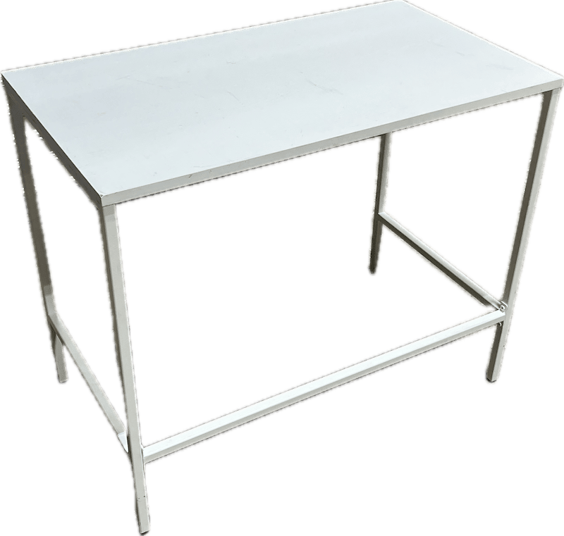 Minimal rectangular desk with a slim white metal frame and matching solid wood top.