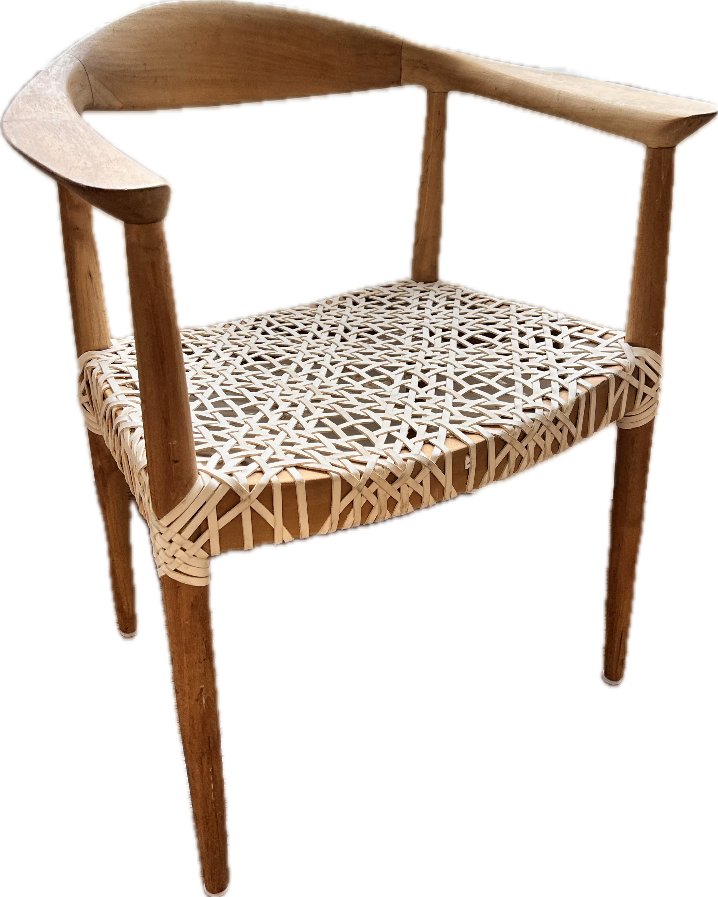 Wishbone style chair with white woven leather seat.