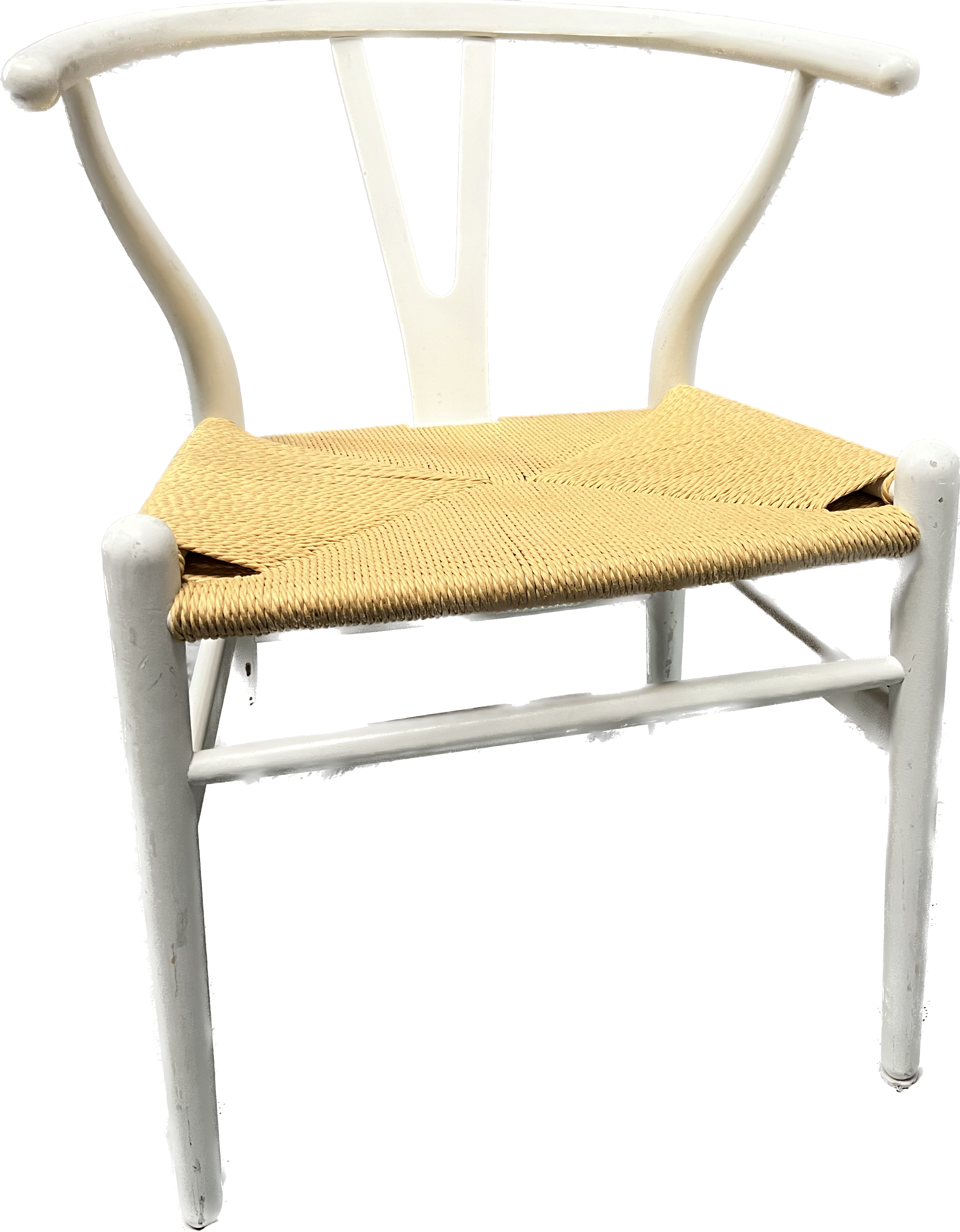White wishbone chair with natural woven seat.