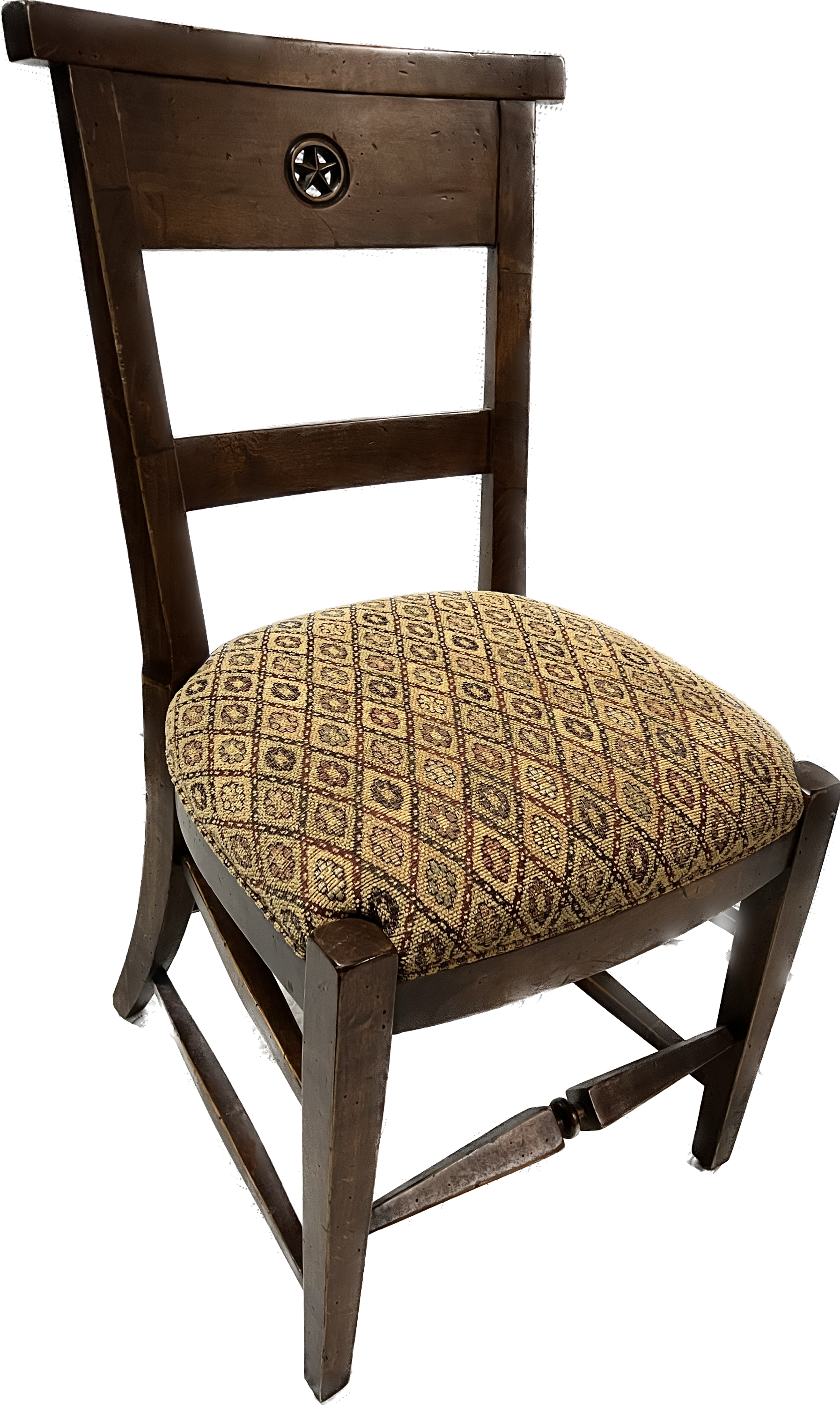 Side chair with beige and brown patterned upholstered seat from Pottery Barn.