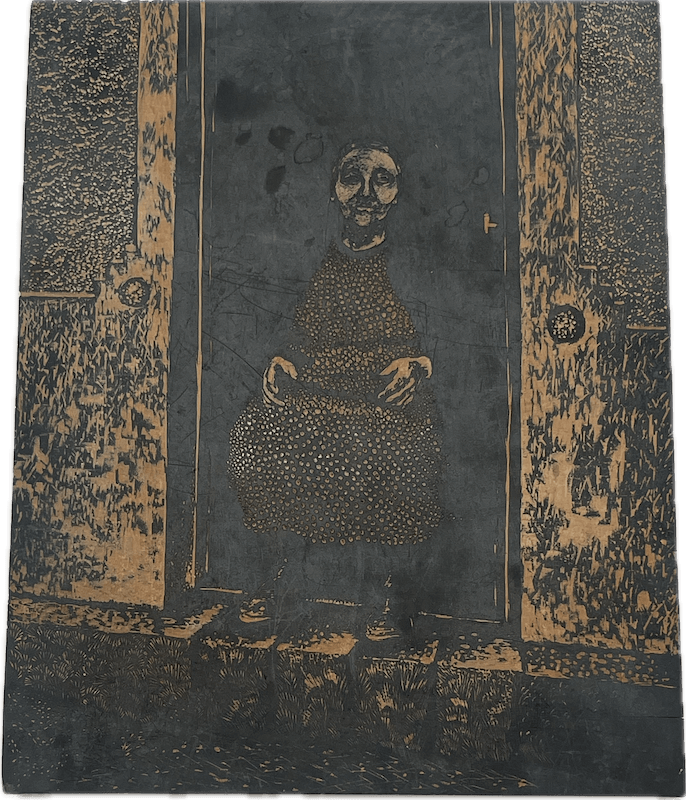 Antique-style wood carving block featuring an engraved human figure framed by ornate patterns. Displays rich patina and visible carving marks.