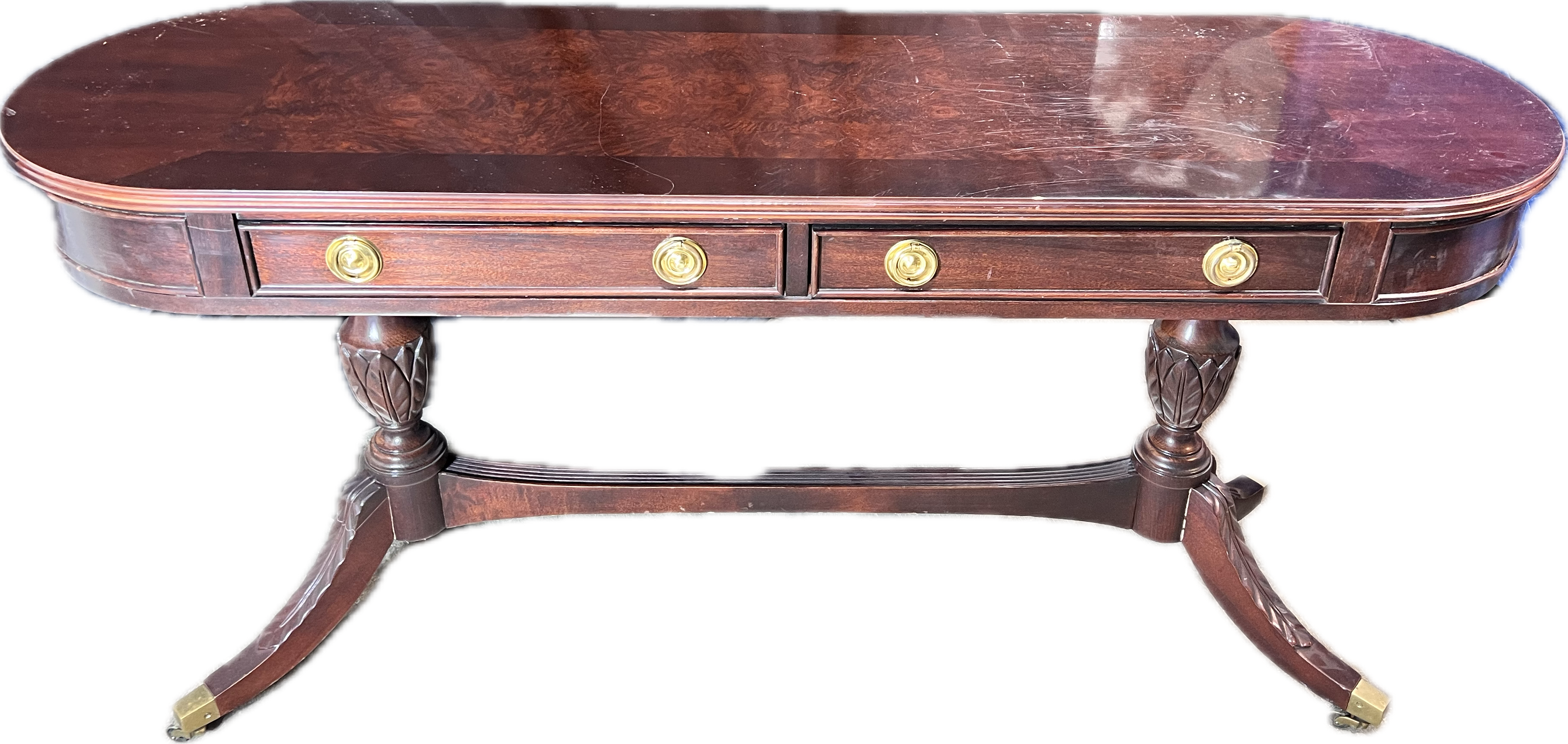 Mahogany console with 2 drawers. Gold metal pulls, detailing and wheels.