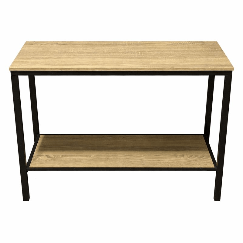 Rectangular console table with wood look top and lower wood shelf supported by a black metal frame. Straight legs and open sides.