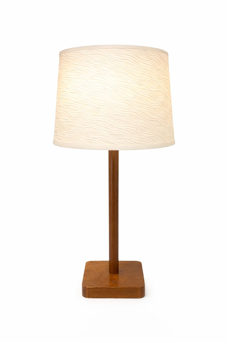 This table lamp features a square wooden base with a slender cylindrical wood stem in a warm medium-brown finish.