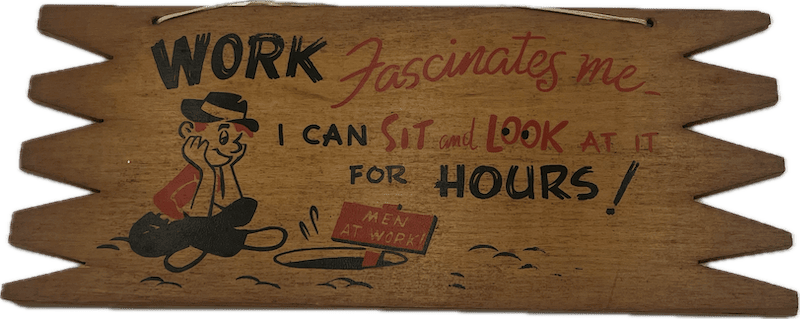 Rectangular wooden sign with humorous painted text reading “Work fascinates me — I can sit and look at it for hours!” Features a hand-painted cartoon figure and jagged edge detailing.