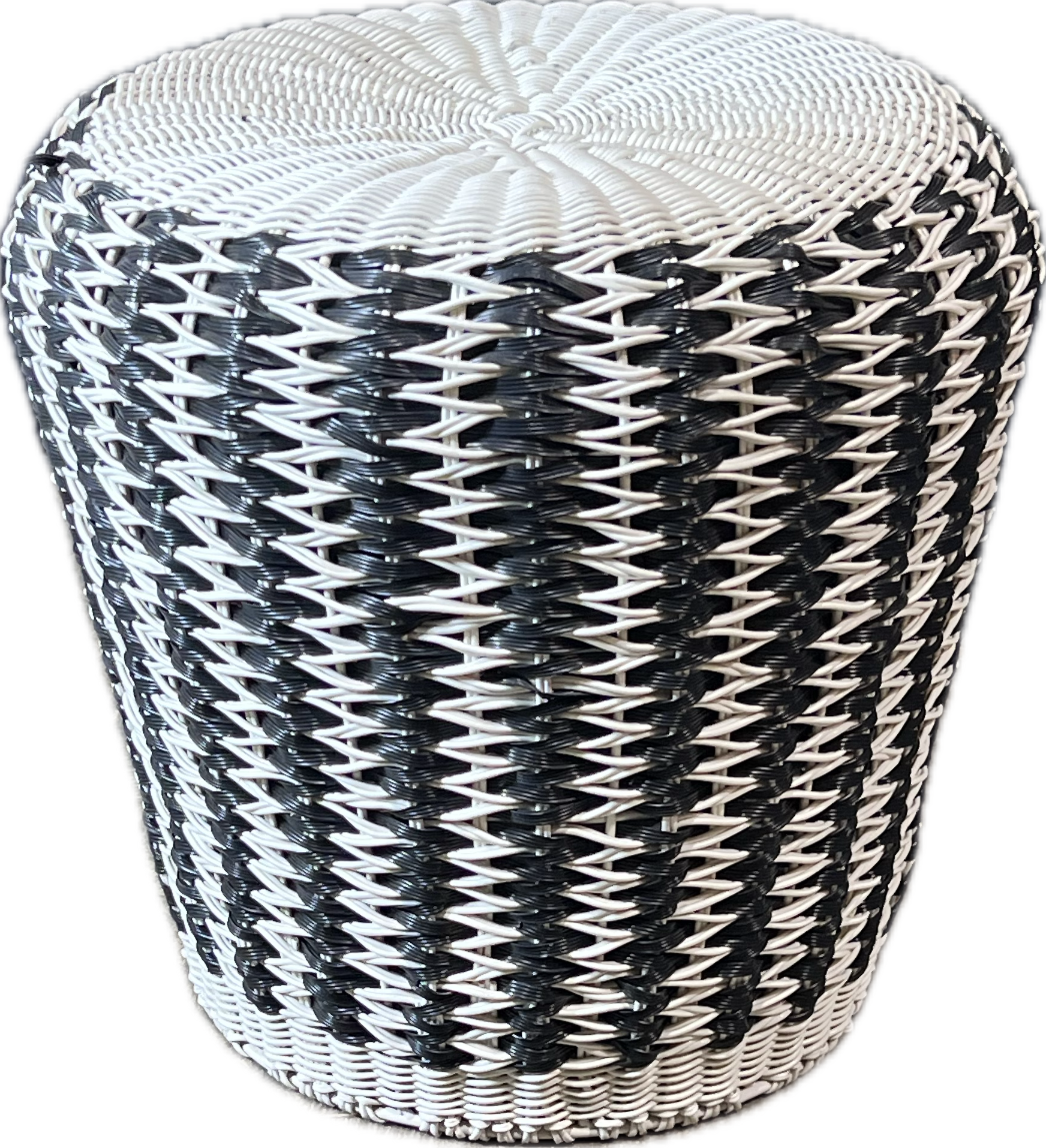 Black and white woven side table for indoor or outdoor use.