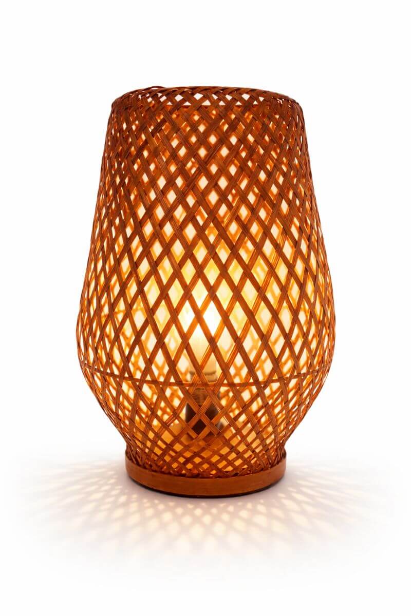 Accent lamp featuring a woven rattan lattice shade with an organic, tapered silhouette.