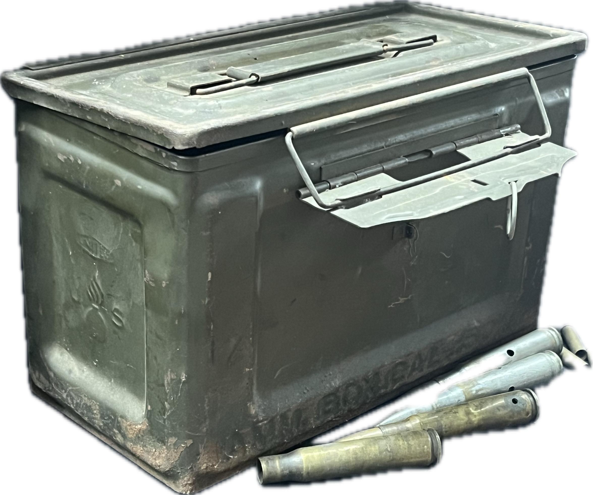WW2 .50 caliber M2 ammunition can, an origianl piece of U.S. military equipment used during World War II.