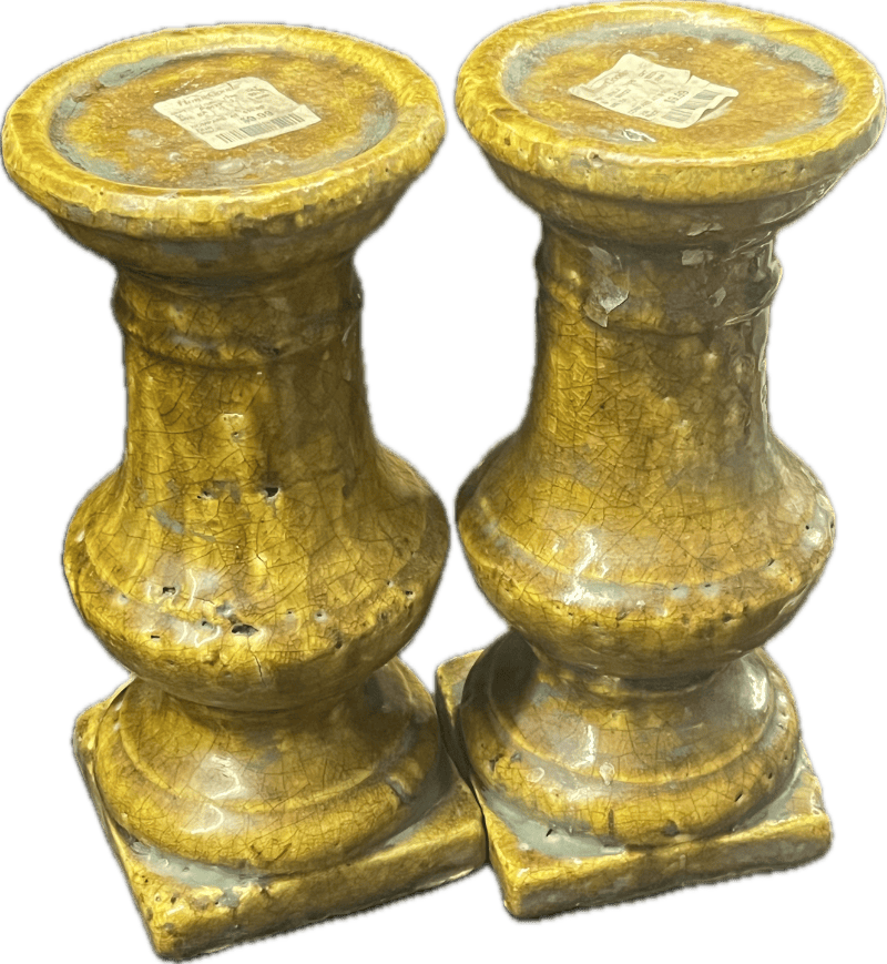 Yellow ceramic candle pedestals with distressed green detail.